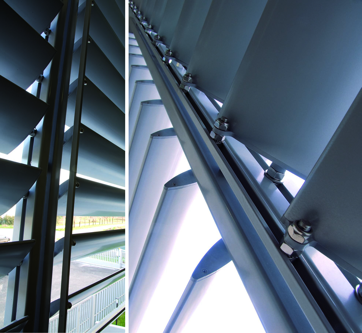 il disegno garantisce un ‘ottima resistenza meccanica e leggerezza. Di facile composizione, il sistema frangisole può essere assemblato con interasse variabile, senza praticare fori sui montanti. La movimentazione delle pale può essere sia manuale che elettrica con attuatore, inoltre, serrando i dadi autobloccanti all’astina di comando, è possibile realizzare una struttura frangisole fissa. L’assemblaggio risulta molto semplice grazie a componenti normalizzati in acciaio inox, facilmente reperibili in commercio.